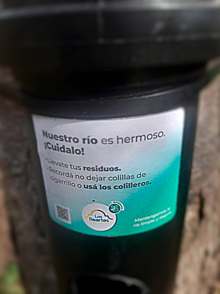 Pero las sorpresas no terminaron ahí, aproximadamente cuarenta personas entre vecin@s, trabajadoras de la Comuna (de la Sala Cuna), scouts del grupo Bucaré de Villa General Belgrano y hasta integrantes de la guardia comunal de Los Reartes 3 se dieron cita a una jornada en donde primó el entusiasmo (hubo espacio para juegos de preguntas sobre el territorio del valle y otras frases de la jefa comunal que traía el viento noreste: “estas acciones nos permite revisarnos” y “todos le erramos en algo”, quizás refiriéndose al tiempo que lleva levantar una colilla del suelo, uno de los ubicuos residuos que podemos encontrar en cualquier caminata sobre la vera del río. Y a propósito de la omnipresente colilla, están siendo efectivos los colilleros (ver fotos 2 y 3) colocados tanto en el río como en locales comerciales e instituciones. Su hacedor y mentor de “guardianes del río”, Franco Di Lorenzo, advirtió que aún no ha empezado la visualización de abundantes residuos en la zona. También recolectó frases interesantes como “hay países como Japón en donde no hay tachos pero no ves un papelito en el piso”. Luego de hora y media de tareas de recolección los participantes volvieron al punto de encuentro munidos de las consabidas bolsas negras y llenos de comentarios en donde las voces de la niñez también traían asombro por lo recolectado: